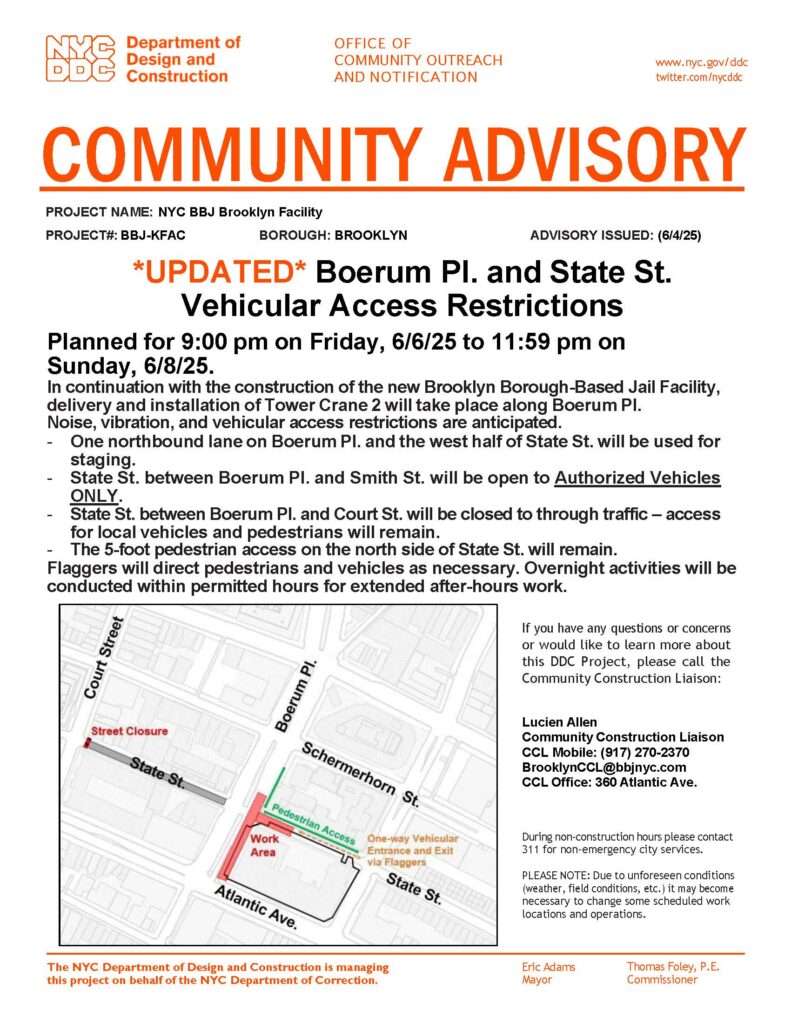 Brooklyn Facility – Advisory Notice (Boerum Pl. & State St. Vehicular Access Restrictions – Tower Crane 2) – 6/4/25