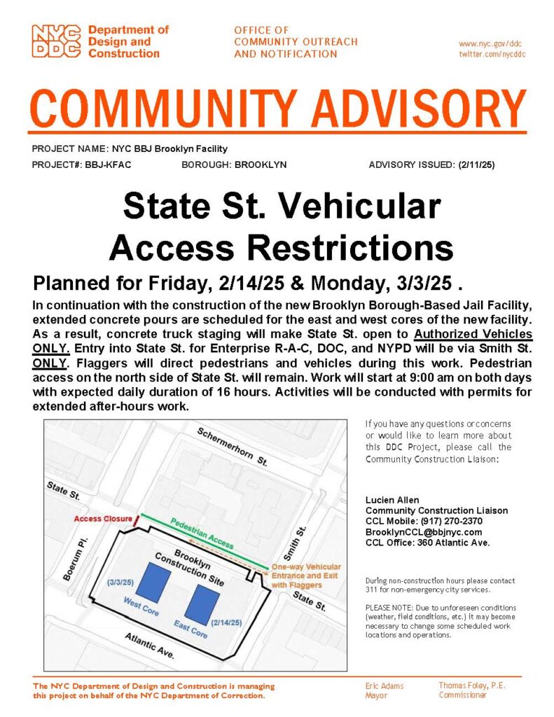 Brooklyn Facility – Advisory Notice (State St. Vehicular Access Restrictions) – 2/11/25