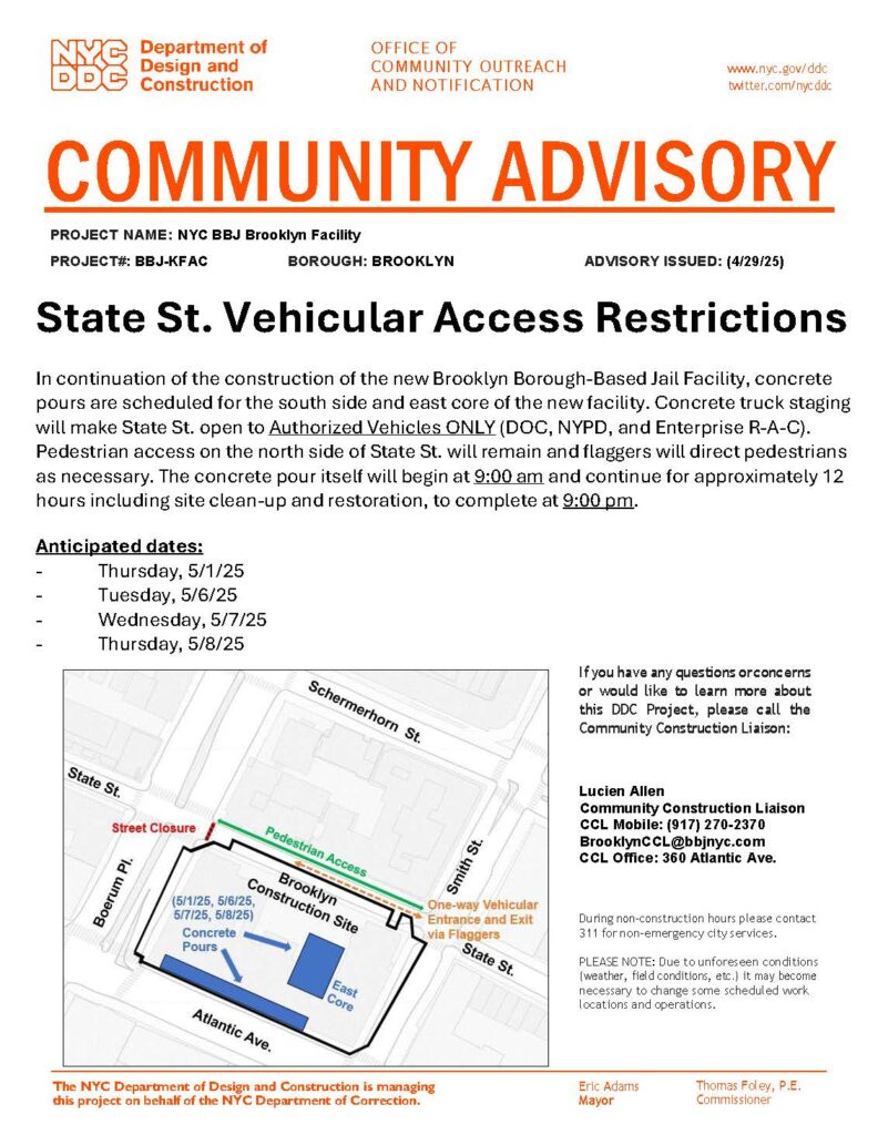 Brooklyn Facility – Advisory Notice (State St. Vehicular Access Restrictions) – 4/29/25