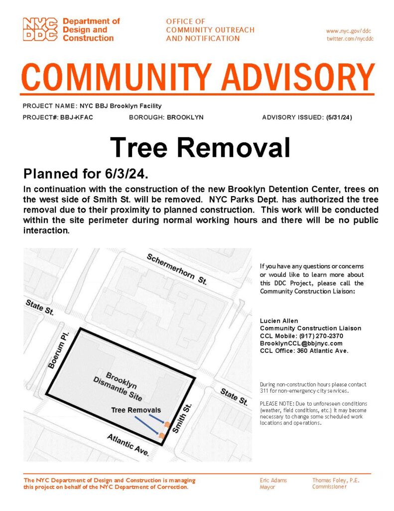 Brooklyn Facility – Advisory Notice (Tree Removal) – 5/31/24